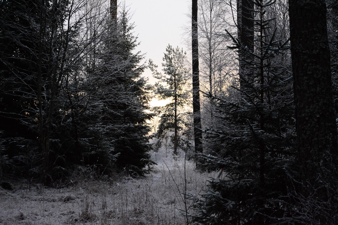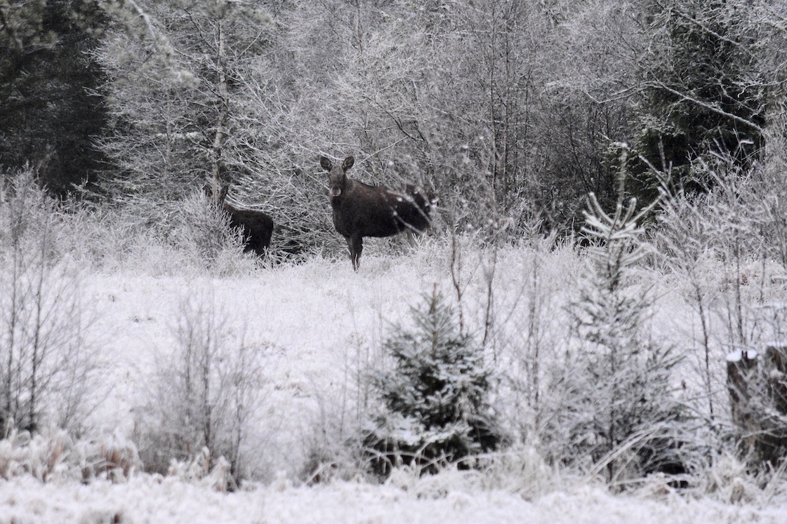 This morning the box had trapped three mice! This time a definitely recognised one of them. Some time in its life it had lost a part of its tail so it was easily recognisable. I went out with them before I drove to the store. We went out on our morning walk as soon as I came home and walked much the same way as when I released the mice. We passed the last little field before entering the forest and something caught my attention. I didn’t see them at first but then I saw them, three moose! One big cow, one calf and the third too small to be an adult moose but still too big to be a calf. I’ve seen them before a couple of times and felt happy that they’ve survived the hunting season so far.