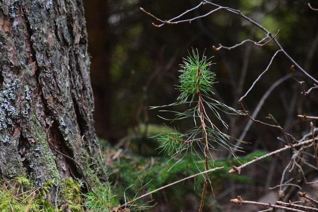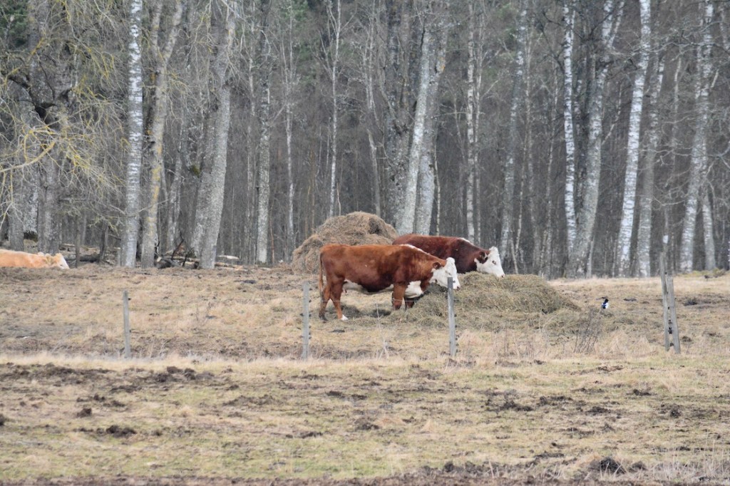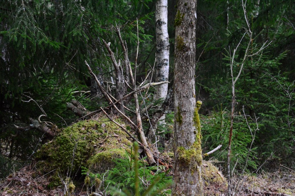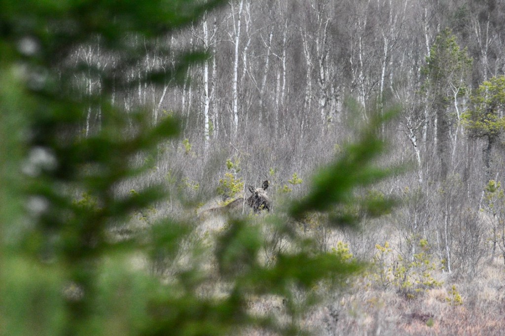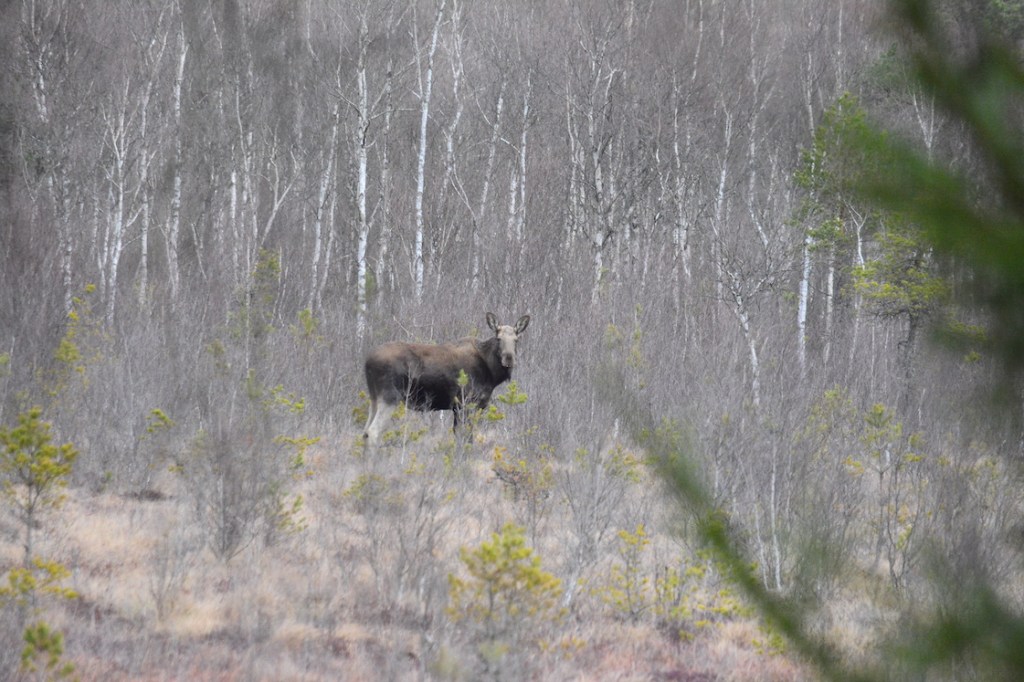 Just as we came out to the end of the peninsula I looked out over the bog and noticed something didn’t look like it normally does. At first I thought it was a big tree that had fallen down and that it was the soil around the roots I could see, so I picked up the camera to take a better look. Turns out that it was a moose sleeping and it had heard us coming. At the same time there was something big running in front of us, I couldn’t see what it was though because it ran in to a thicket of young trees. Then suddenly I could hear lots of wild hogs running in the other direction and that was a bit too much for the dogs, even Malkolm felt the need of barking and he never does that when he see or hear wildlife 🙂 🙂