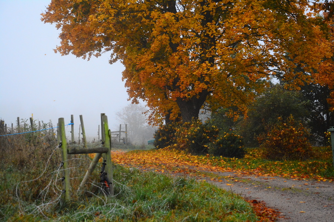 I woke up in the middle of the night because too much tea I guess π π and naturally I couldn’t fall asleep especially quickly leading to me sleeping unusually long and when I looked out the window I could see the ground was covered in unusually thick fog. The dogs and I rushed to go outside, took perhaps as most ten minutes and by that time almost all of it had vanished. I was a bit annoyed to be honest but then the sun shone and the leafs in the trees looked like they were burning, so I stopped being annoyed π π