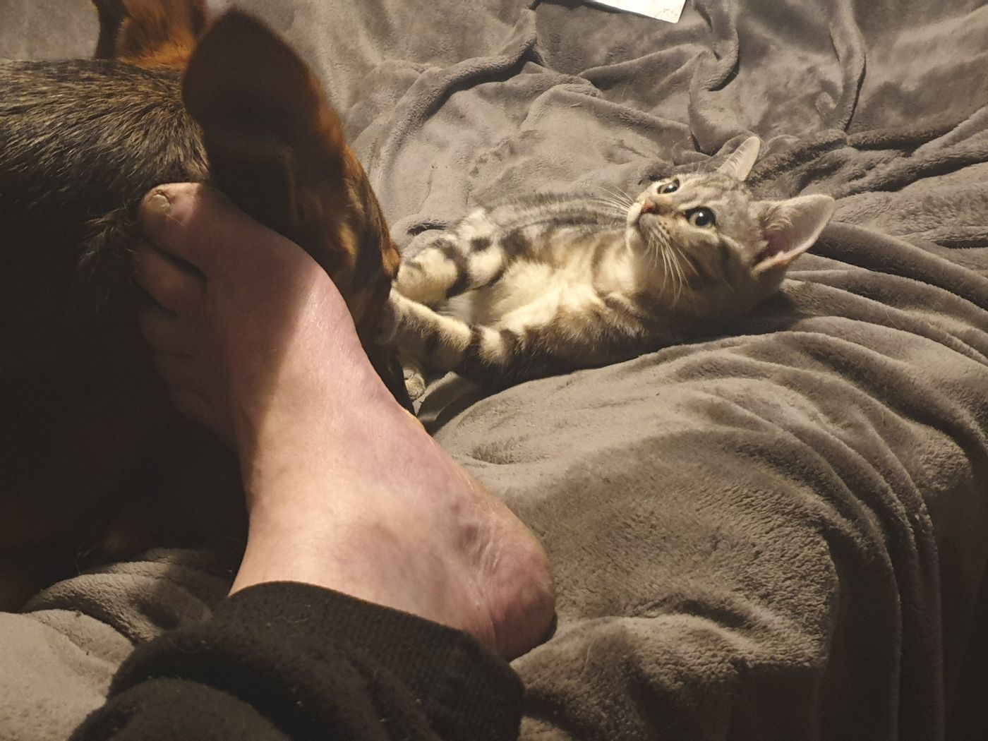 Sara the monster kitten is now in to destroy all my orchids π Those that look like grass when they don’t flower. She likes to play with the leafs and when she does get a grip on them she tears them down on the floor π π She also attacks the dogs all the time, not that they care especially much but one day her claws and teeth will reach the skin and then they might π π On the other hand Malkolm plays rather tough when he plays with her so I guess it evens out π π