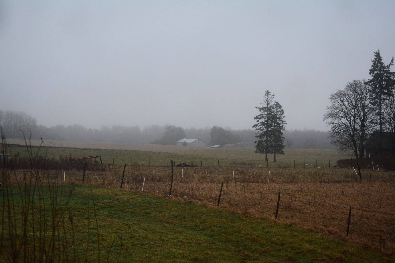 We woke up to a cold and foggy world today which, despite the cold, is one of my favourite weathers π So as soon as it was light enough the dogs and I walked out to the bog. If I had known the fog would stay all day we would have had a longer walk down to the creek and out on the bog there. Days like these are quiet days, not only does the fog dampen sounds from the big road but also no birds make any sounds at all. Well there was these two ravens flying above us who made their metallic sounds a couple of times but that was it.