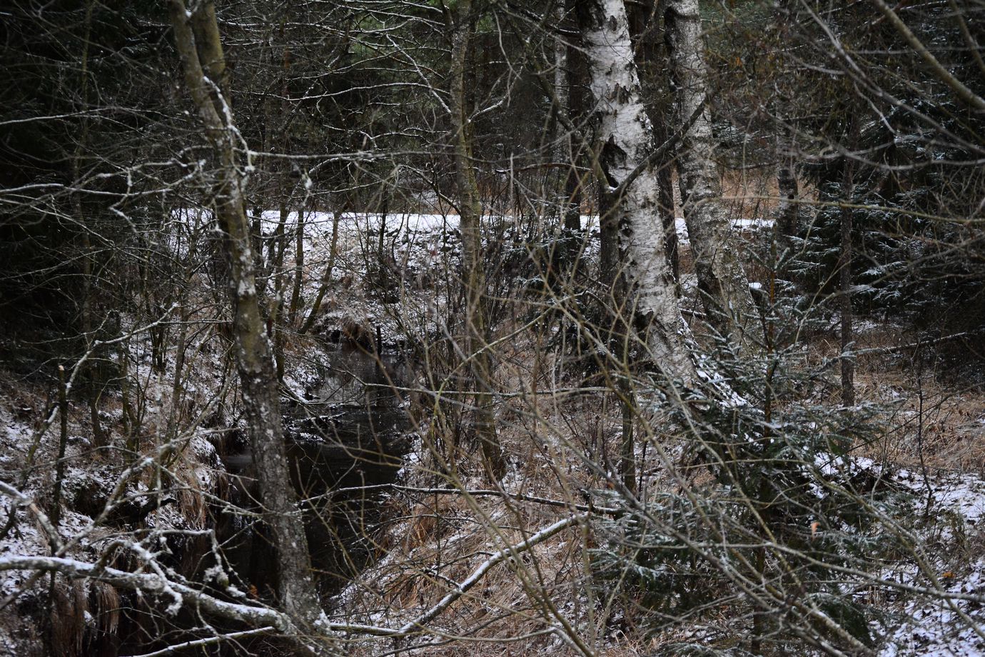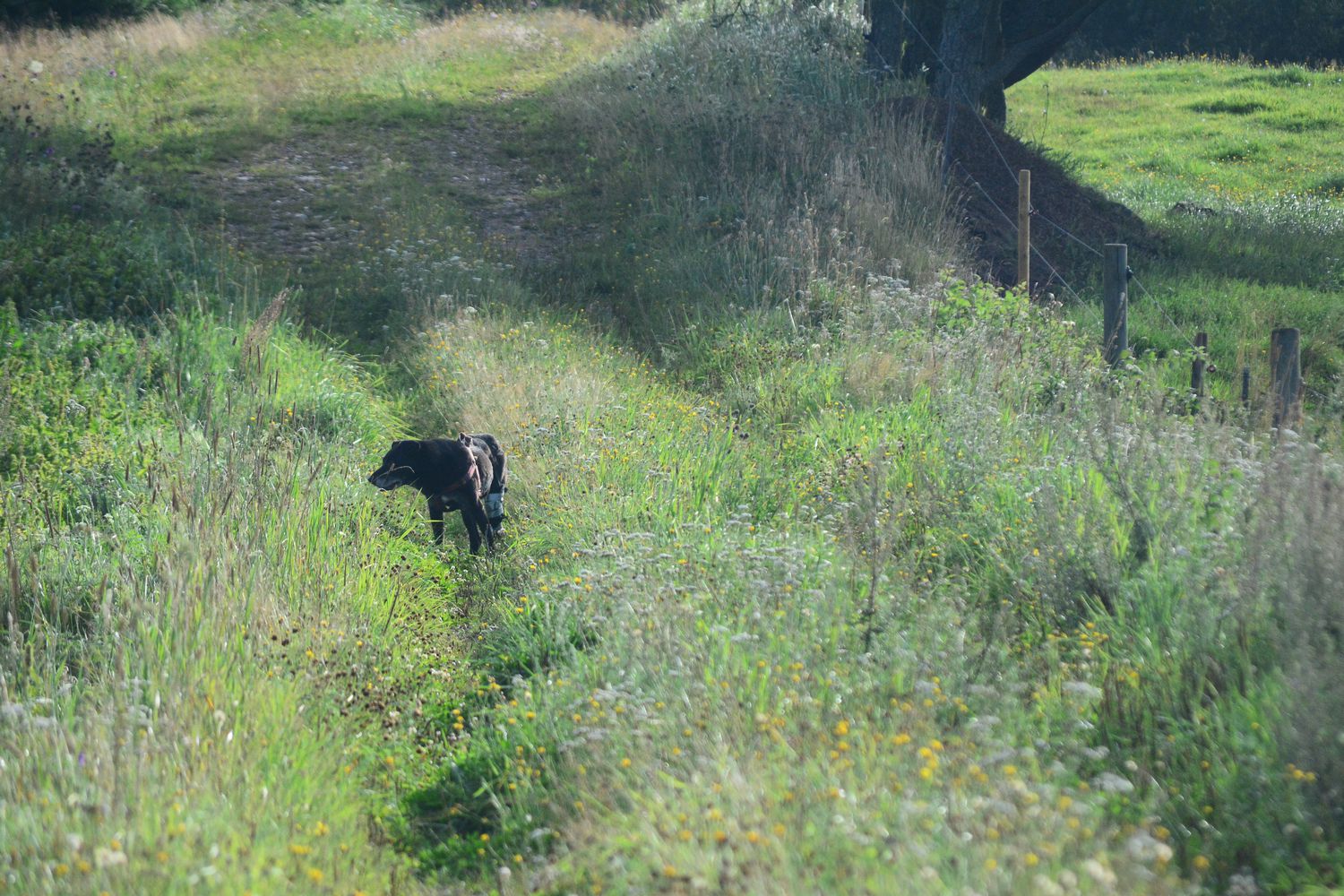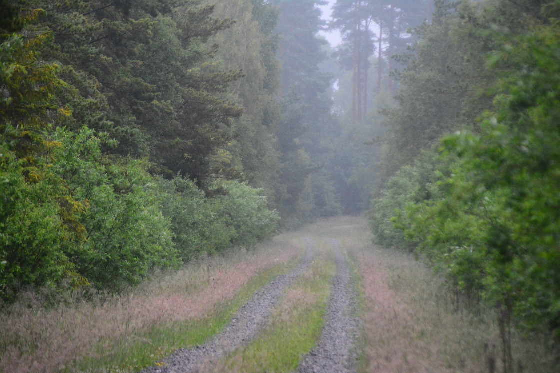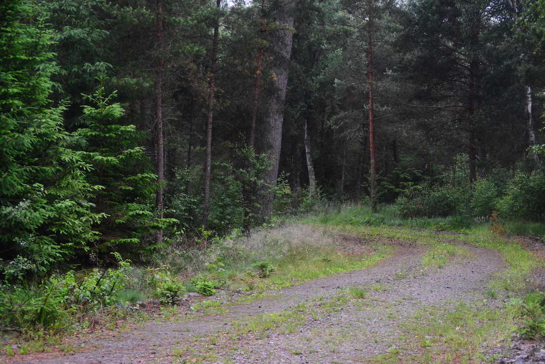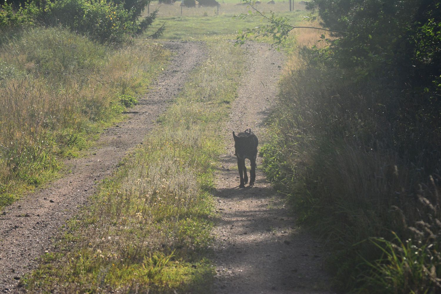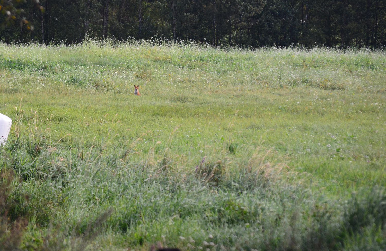 Nothing special happened during our walk until we were almost at home again, one of the fox cubs stood beside the gravel road and this time I could get a few photos of it. It didn’t notice us because it was looking at the other direction and we stopped rather early so we wouldn’t scare it away. Alma started to whine loudly but for once she listened to me and just looked at the fox. It still has its baby fur but has grown rather large so I guess it won’t be long before it is time for it to find its own new home.
