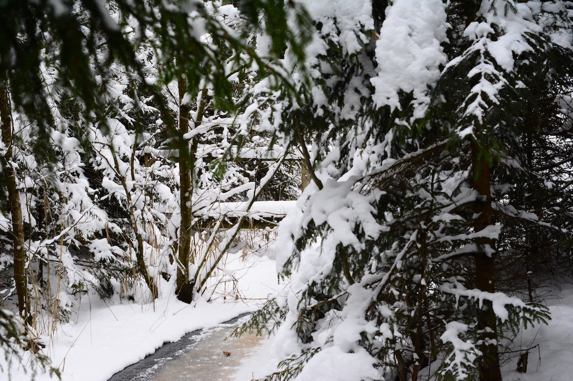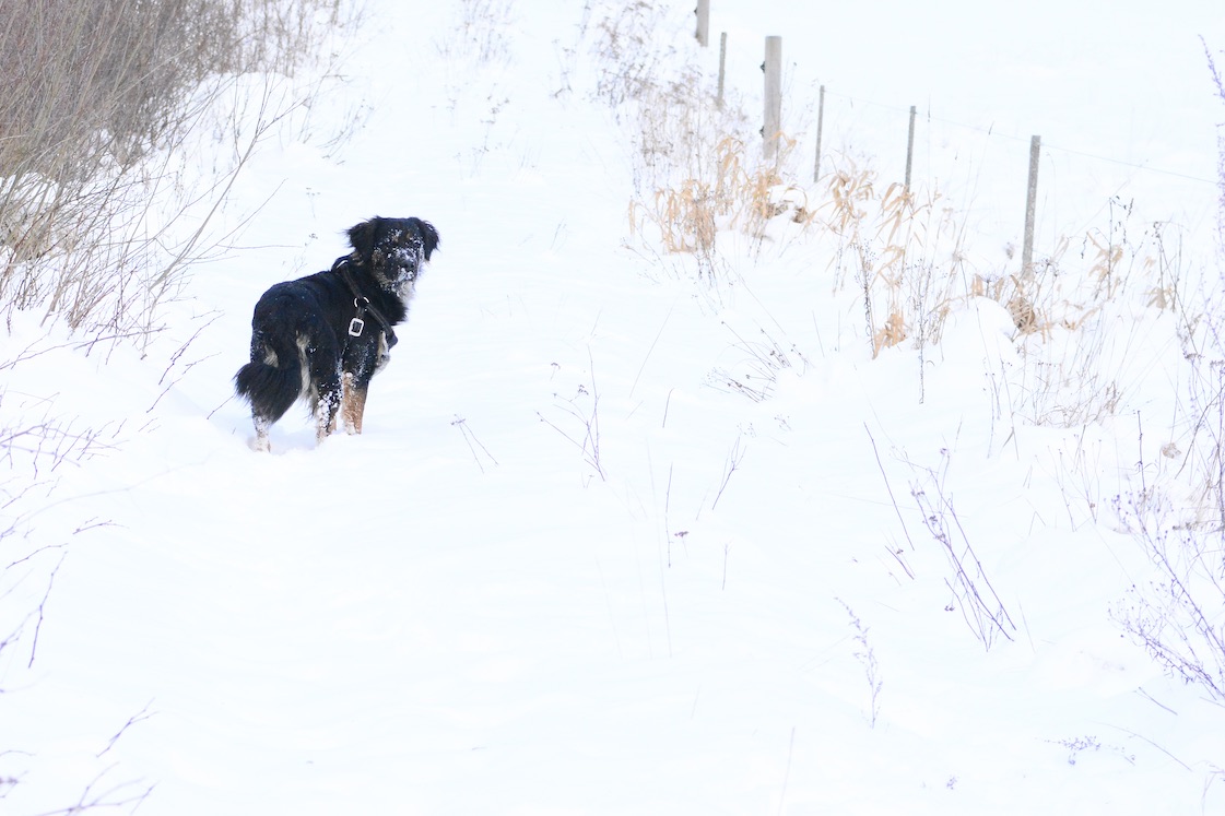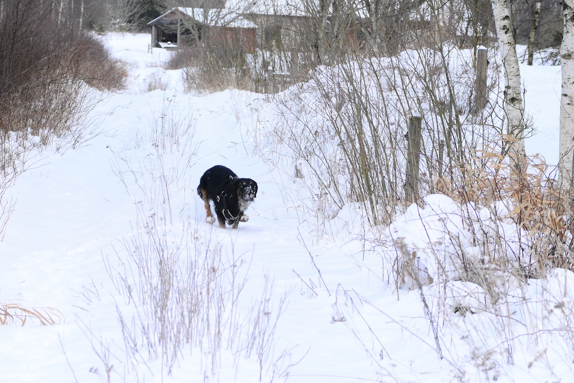 We walked down to the creek this morning and as long as we walked on the gravel road everything was fine but then we followed the creek and only had our old tracks to walk in and the wind had blow a lot of snow in those tracks so it was like walking in potato flour, I never knew what way I would slide π π It was even worse in the fields because the perfectly smooth snow surface didn’t show where the wild hogs had been digging π :-)Sometimes the snow barely reached the sole of my shoes, sometimes I stood in knee deep snow π π π