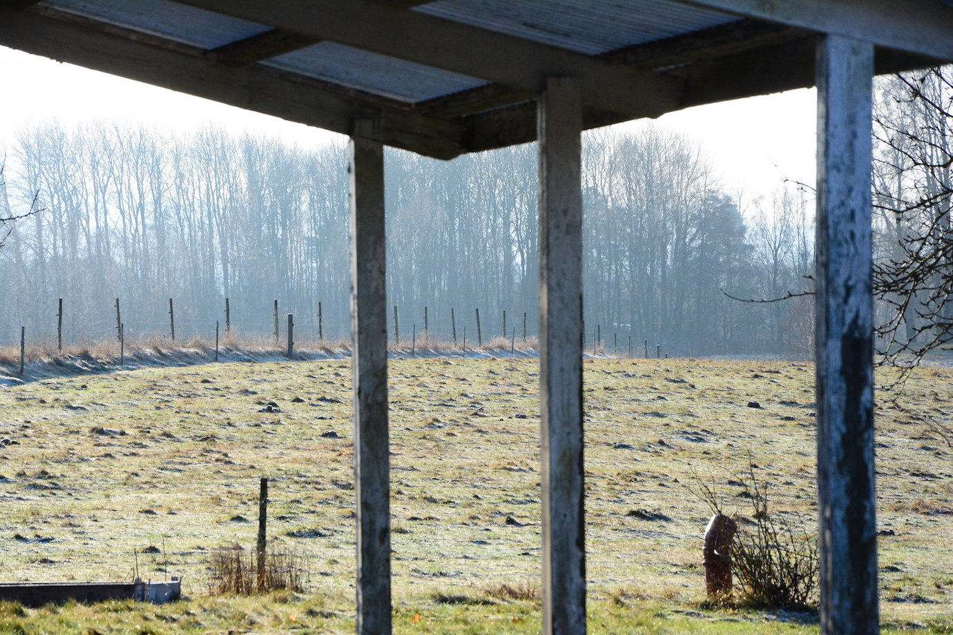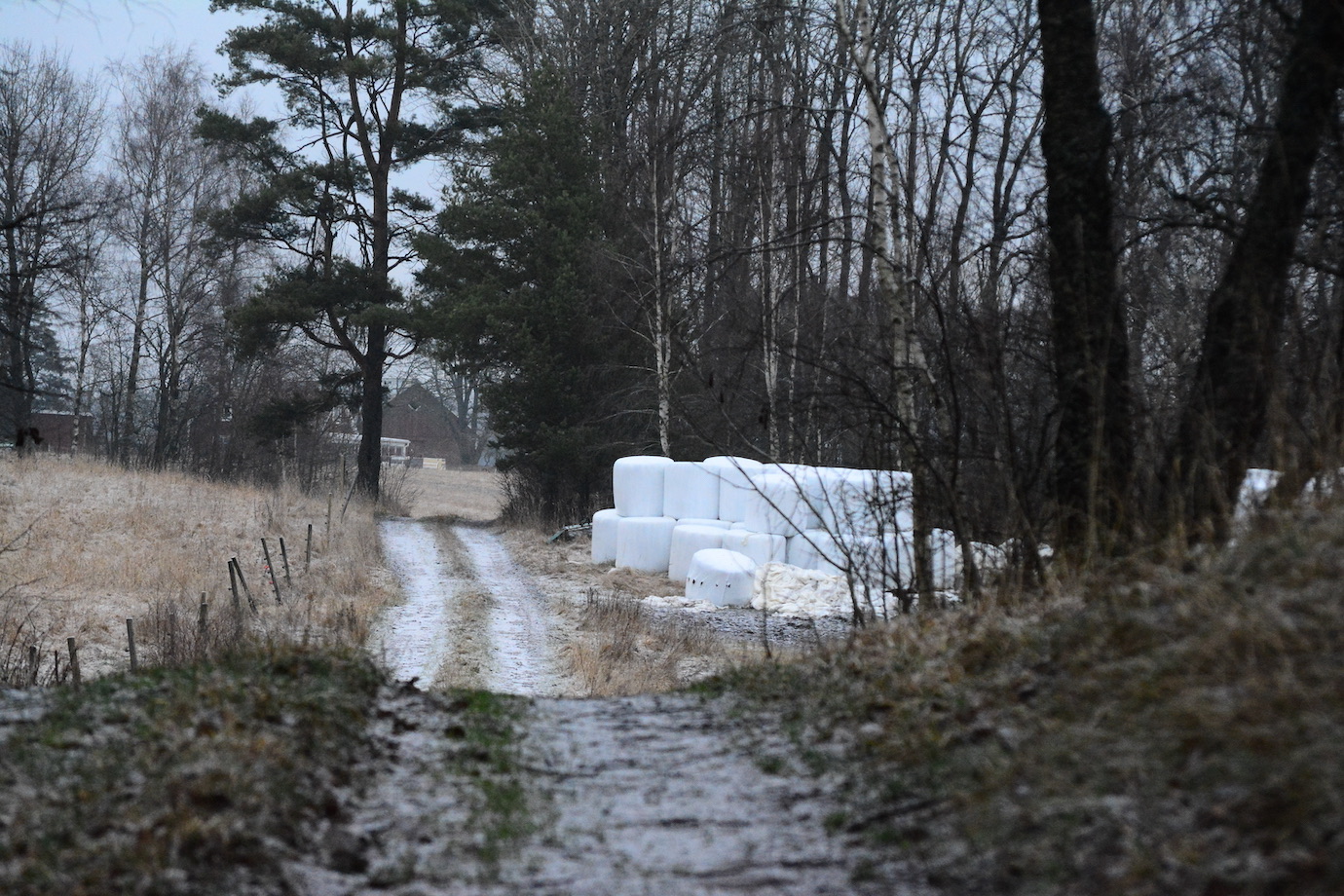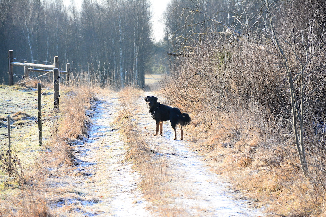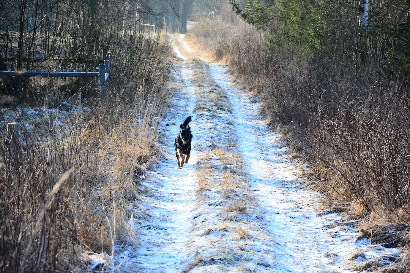 We went out for our morning walk as soon as the temperature had risen to -9 C (15,8 F) and since would be walking down to the creek the sun would warm up the air quite fast when walking between the trees on the gravel road. Alma wouldn’t make our walk especially enjoyable today and she showed that as soon as we started to walk but I couldn’t figure out why, not until we came closer to the creek and I saw that the horse guy was working today. It is something with Alma and especially horses and the cattle in the neighbor pasture.
