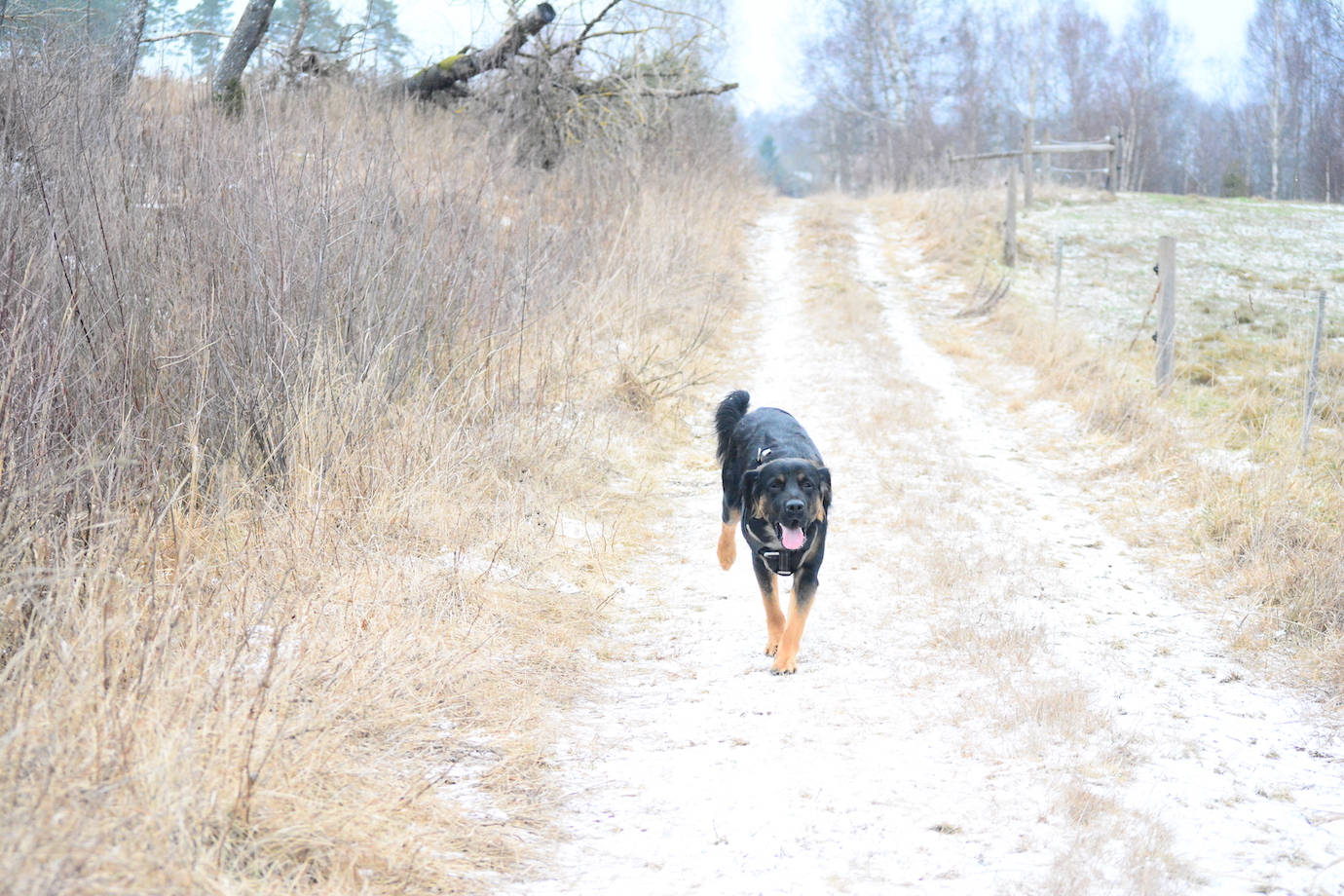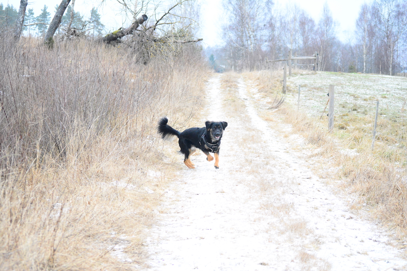 But instead of walking in to the forest we walked down on the road we usually comes home on when we’ve been down to the creek, so today Malcolm had the chance of running leash free at the start of our walk 🙂  We did however not follow the road down to the creek but instead turned left, a road we used to walk a lot until two dogs just as bad as Alma 🙂 🙂 🙂 moved in to a tiny cottage at the end of the road. Too much struggle to go through every time we would have passed. Now days there’s only one dog left there and so much easier to pass, especially since there now is a huge pile of dirt blocking the view for both the dog in the garden there and my two 🙂